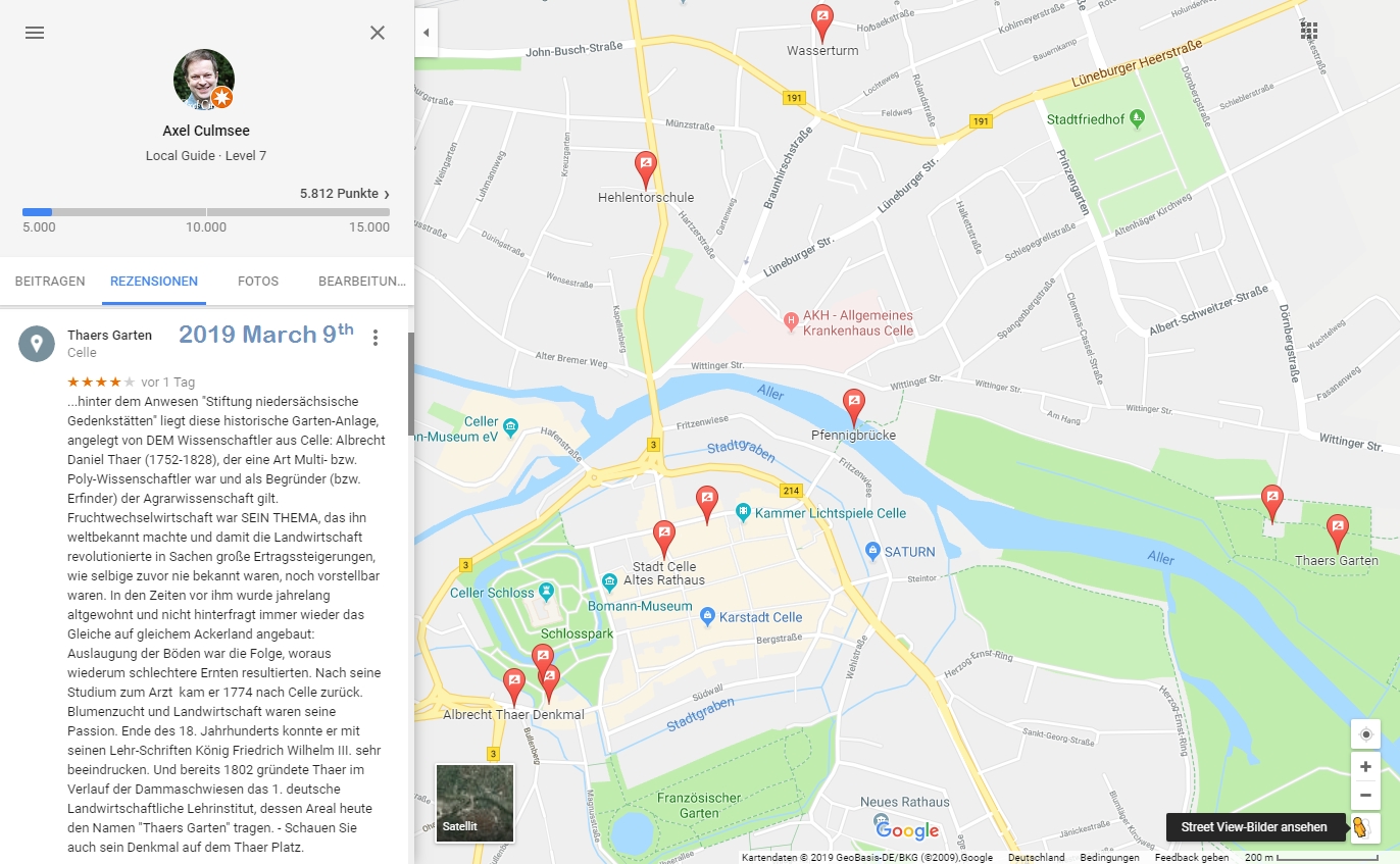 Albrecht Daniel Thaer (1752- 1828) war eine Art Multi-Wissenschaftler und wird angesehen als Erfinder bzw. Begründer der Agrarwissenschaft. Schlagwort ist die sogenannte Fruchtwechselwirtschaft, die große Ertragssteigerungen hervorbrachte (in den Zeiten davor wurde jahrelang immer das gleiche auf einem Feld angebaut, wodurch die Böden auslaugten und kaum noch Nährstoffe beinhalteten). – Ausgebildet als Arzt kam er 1774 zurück nach Celle. Zunächst waren Blumenzucht und Landwirtschaft seine Hobbys (wie man heute sagen würde). Zum Ende des 18. Jahrhunderts konnte er mit seinen Schriften König Friedrich Wilhelm II. beeindrucken. 1802 gründete er in den Dammaschwiesen das 1. Lehrinstitut für Landwirtschaft, das heute als „Thaers Garten“ bekannt ist.